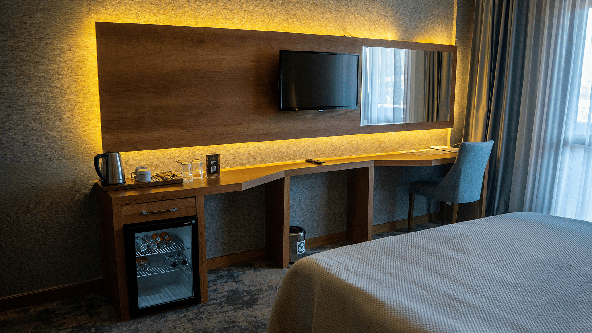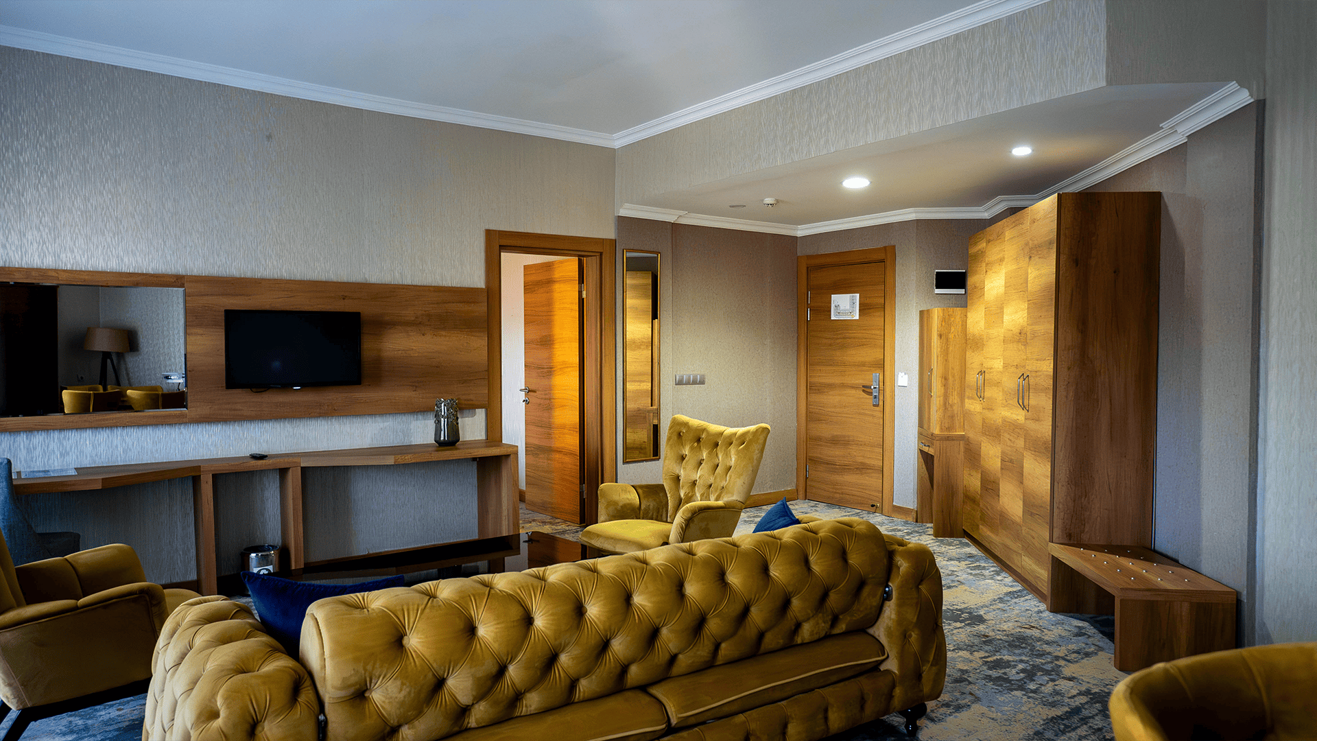 King Suite oda 4542  genişliğinde konforu ve doğallığı bir arada sunan Jakuzili Termal Suit’imiz, 45 m² genişliğiyle ferah bir konaklama deneyimi vadediyor. Yatak odası ve ayrı oturma alanına sahip bu özel suitte, termal suyla dolu jakuzide rahatlayabilir, modern duş alanıyla tazelenebilirsiniz.